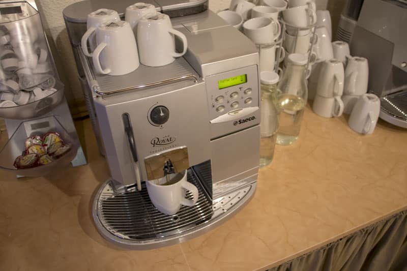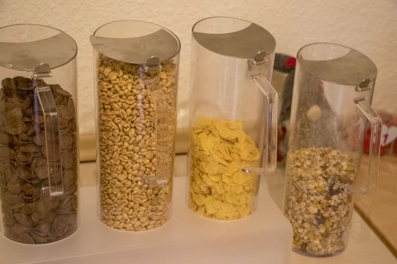 Im Frühstücksraum gibt es ein großes Buffet. Hier findet man Müsli, Joghurt, frische Brötchen, Marmelade, Wurst und Käse, Eier und vieles mehr. Getränke wie Kaffee aus dem Vollautomaten, Orangensaft und Multivitaminsaft, Milch und Kakao sowie Tee stehen ebenfalls zur Verfügung.