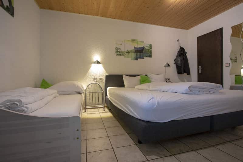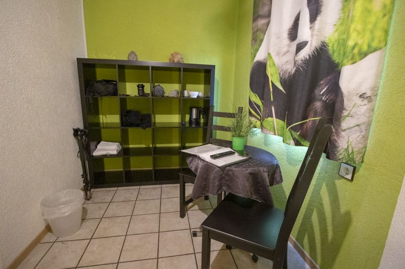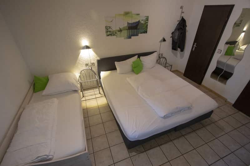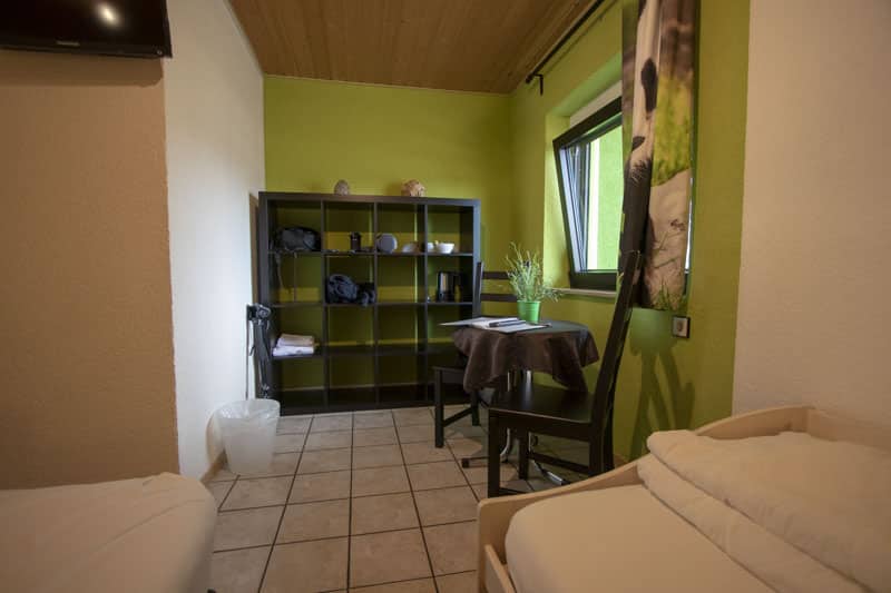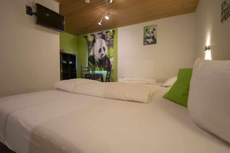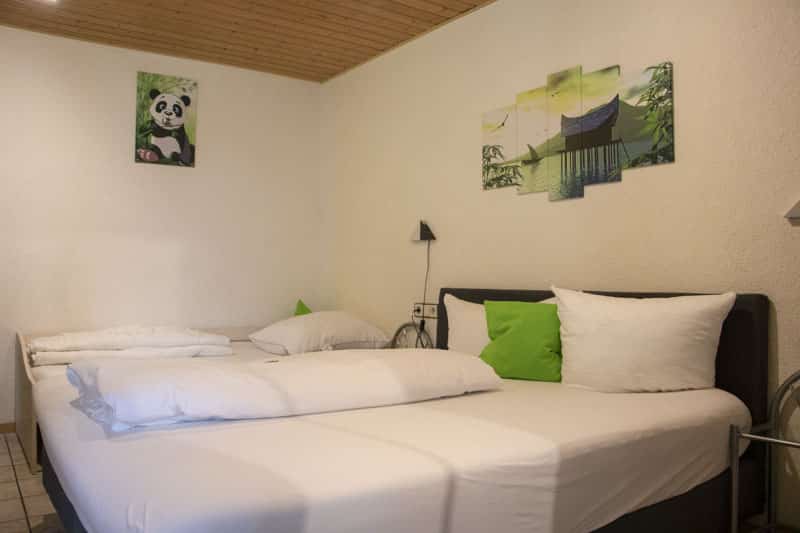 Das Zimmer Nummer 12 liegt im Themenbereich Asien. Ein Doppelbett und ein Einzelbett bieten Platz für 3 Personen. In der Ecke gibt es einen kleinen Tisch und ein Ikea Regal mit vielen Fächern. Der kleine Fernseher an der Wand bietet nicht viele Programme, aber zum Fernsehen ist man ja auch nicht dort.