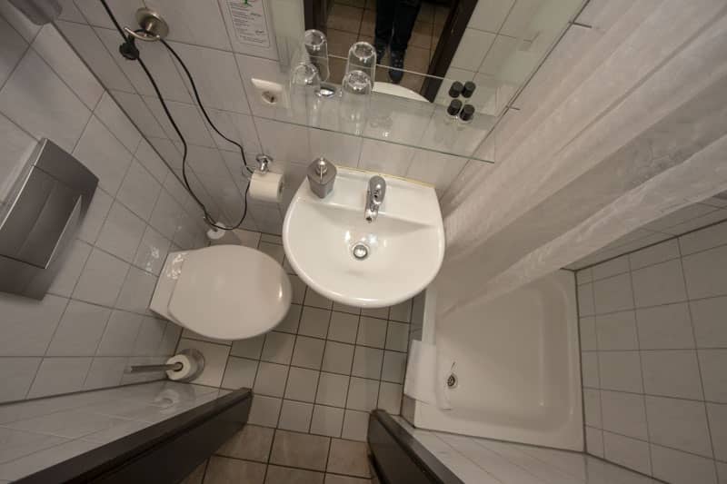 Das Zimmer Nummer 12 liegt im Themenbereich Asien und somit im Haupthaus. Ich gehe durch den Frühstücksraum und finde mein Zimmer in einem Flur auf gleicher Etage. Dieses ist sauber und ordentlich. Es gibt einen Fernseher, einen Fön im Bad und Handtücher sind ebenfalls vorhanden. Das Bad ist allerdings wirklich klein, was aber nach Rücksprache mit der Eigentümerin Frau Sigg nur im Themenbereich Asien so ist.