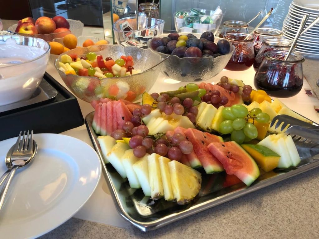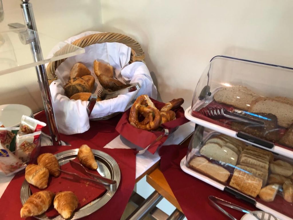 Der große Frühstücksraum bietet viel Platz. Auch hier fällt viel Licht in den Raum und so kann man gut in den Tag starten. Das Frühstücksbuffet ist abwechslungsreich und auch frisches Obst und Gemüse gibt es hier. Standards wie Brötchen, Müsli, Marmeladen, Wurst und auch Croissants findet man am Buffet.