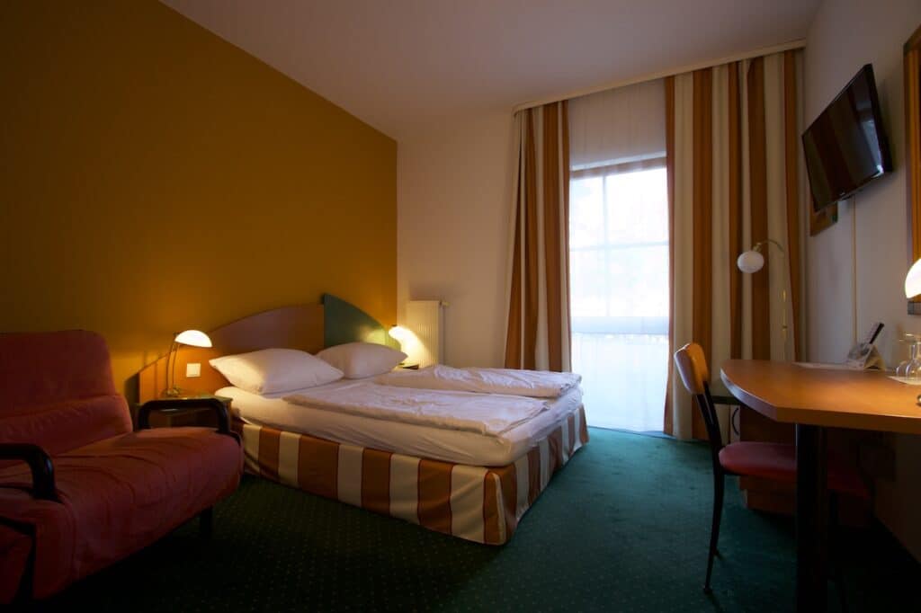 Mein Doppelzimmer liegt im Erdgeschoss, was ich persönlich eher nicht so mag. Mit Sicht auf den Parkplatz eine eher mäßige Aussicht. Das Zimmer als Solches ist jedoch ausreichend groß und neben einem Fernseher gibt es einen Schreibtisch, eine Lampe und einen Sessel.