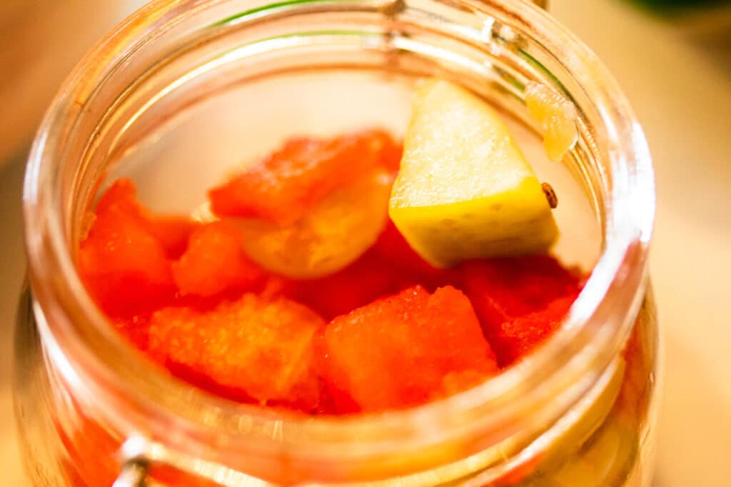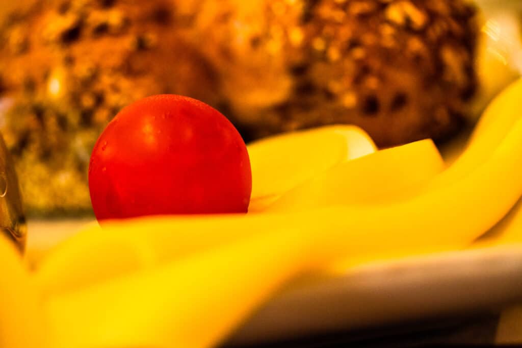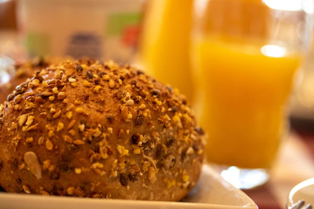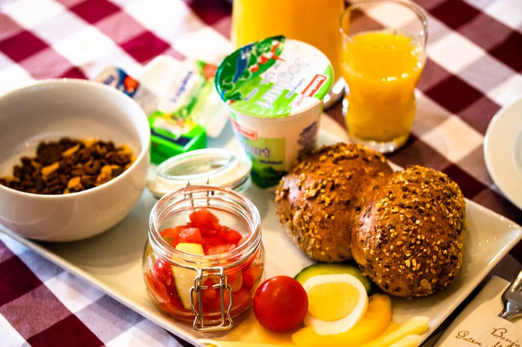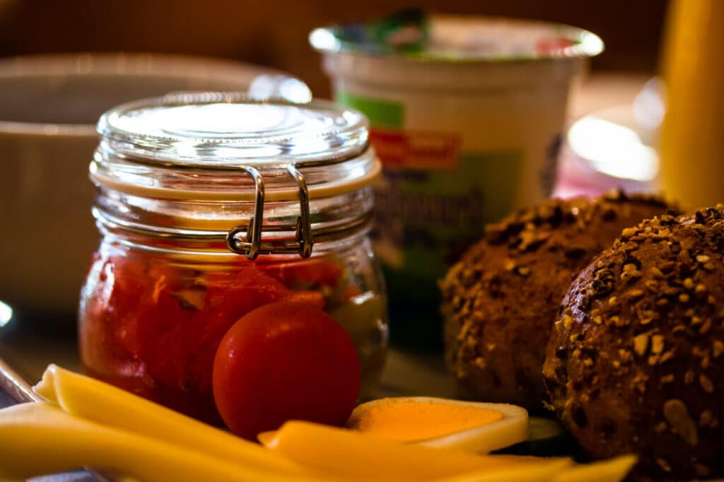 Die frischen Brötchen sind vom Bäcker und die Marmelade aus der Region. Das freut uns immer sehr und die Brötchen und Croissants waren echt lecker. Dazu gibt es frisches Obst, bereits klein geschnitten im Glas.