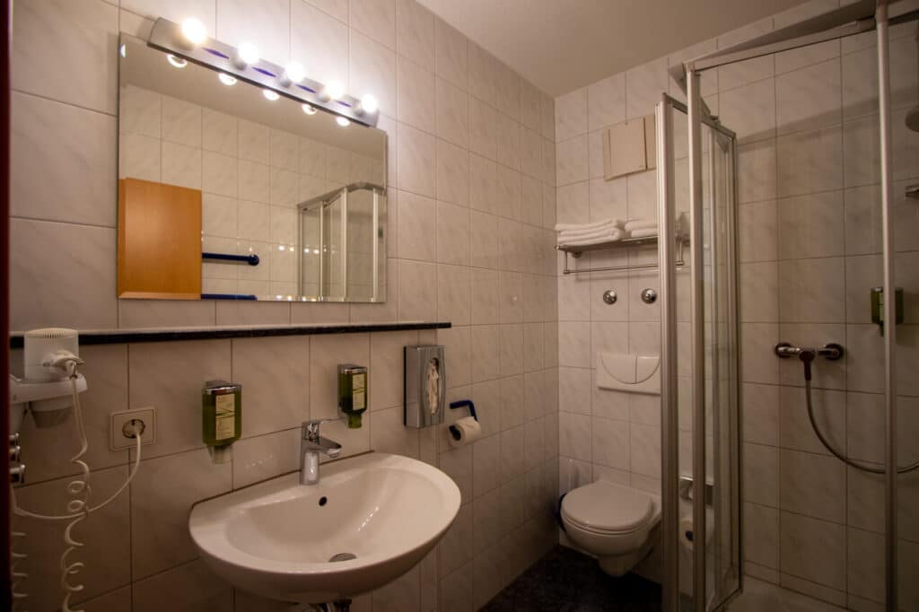 Im Badezimmer findet man alles, was man benötigt, um sich zu erfrischen. Eine Dusche mit Seifenspender, ein Waschbecken mit Seife und Bodylotion, ein Fön und natürlich ein WC sind vorhanden. Ebenfalls frische Handtücher, die auf Wunsch täglich gewechselt werden oder nach Bedarf.