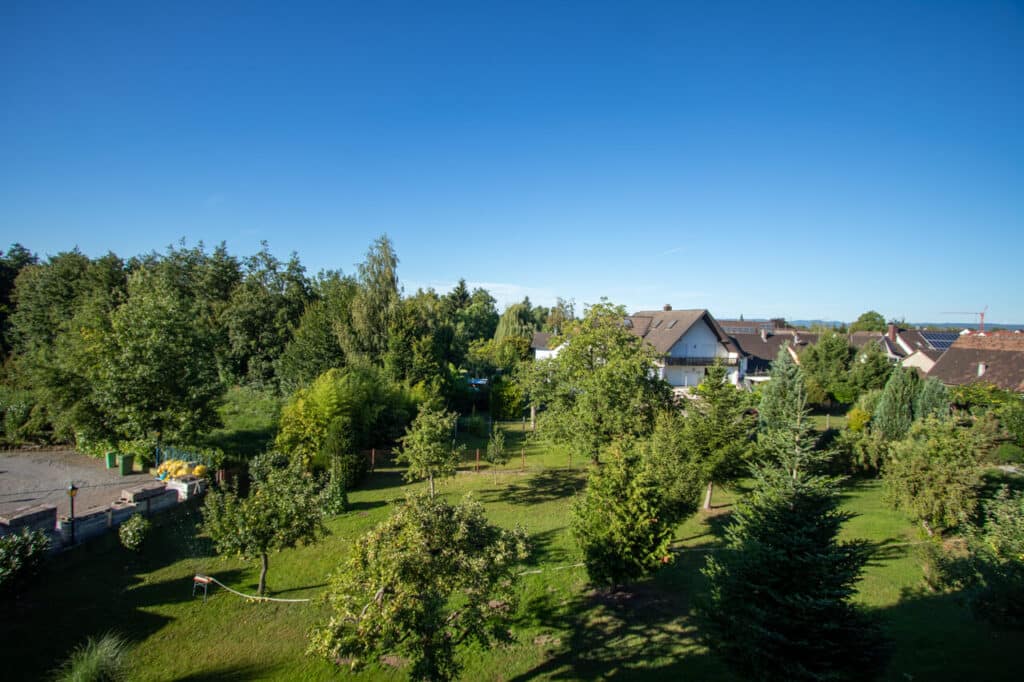 Mein Doppelzimmer liegt im 2. Stock. Vom Flur aus sehe ich durch ein Fenster das Voletarium. Im Zimmer hingegen habe ich Ausblick ins Grüne…. Ein großer Kontrast, aber sehr schön.