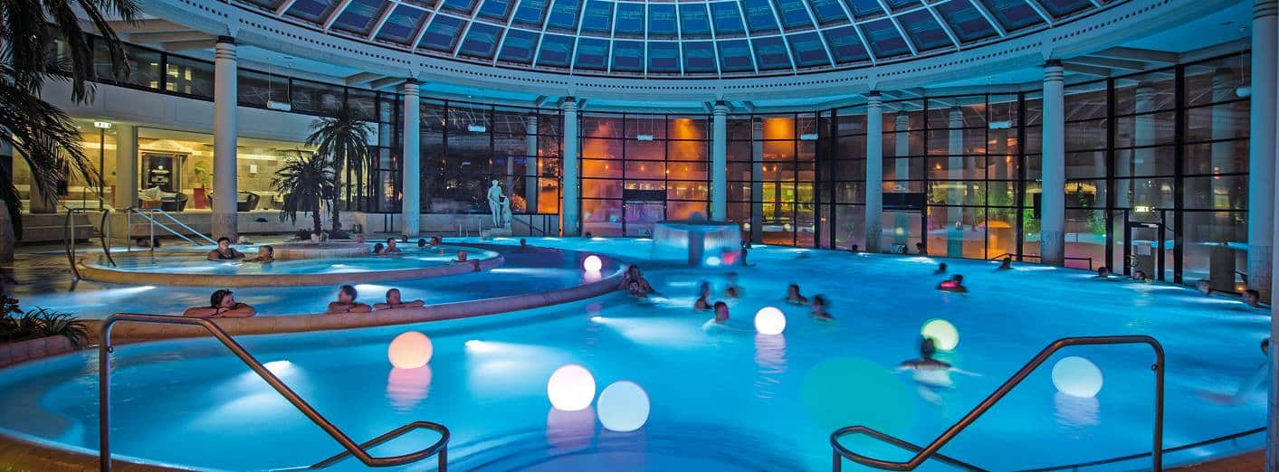 Abwechslungsreiche Becken und Temperaturen zwischen 18°C und 38° C laden in der Caracalla Therme zum ausgiebigen Badevergnügen im wohltuenden Thermalwasser ein. Neben den attraktiven Badebecken erwarten Sie im weitläufigen Innenbereich eine Felsengrotte mit heißem und kaltem Wasser, ein erholsames Aromadampfbad und ein Sole-Inhalationsraum.