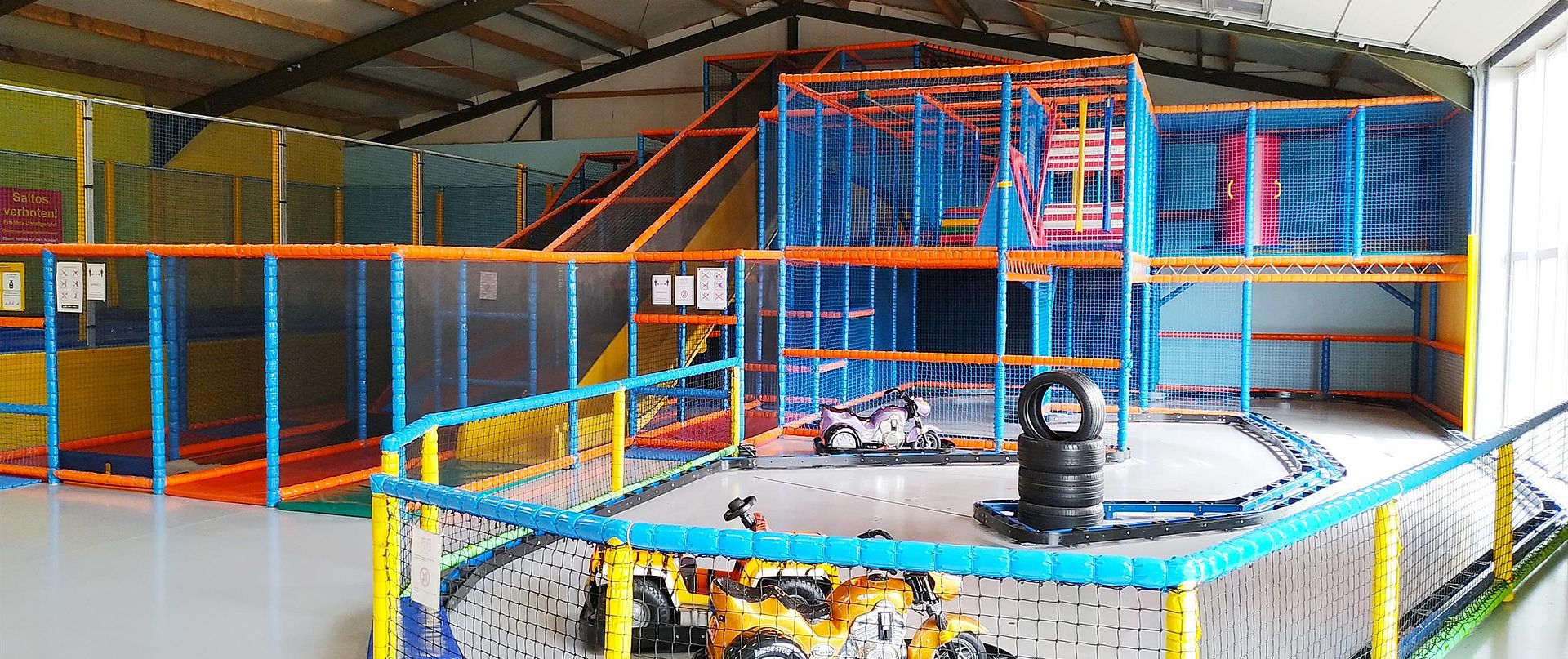 Ihr könnt bei uns im Kletterturm klettern, auf den Trampolinen hüpfen, im Bällchenbad spielen und vieles mehr.