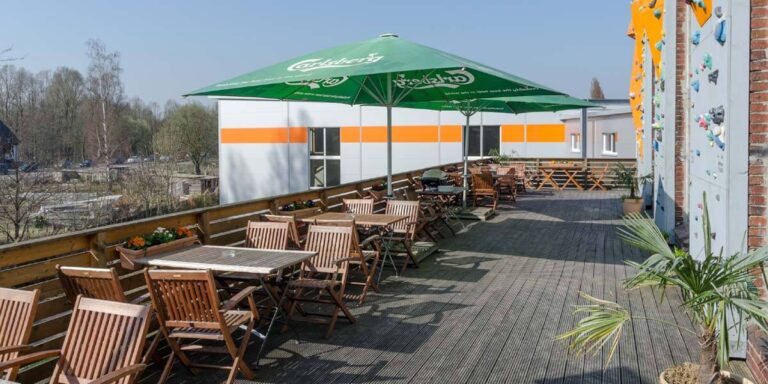 Mittendrin, umrundet von Kletterwänden liegt das Bergwerkcafé, eine coole Location für bis zu 50 Personen. Hier gibt es kleine Snacks, italienische Kaffeespezialitäten, nichtalkoholische Getränke, Bier und Weizen vom Fass. Mit dem Blick auf das Klettergeschehen schmeckt’s hier besonders gut