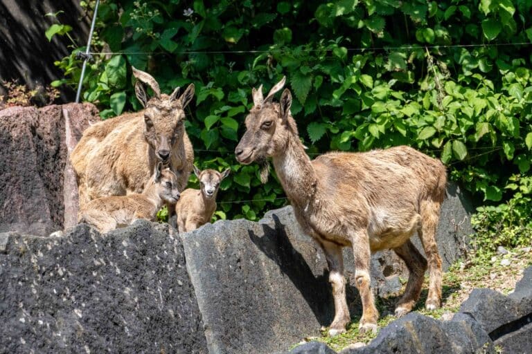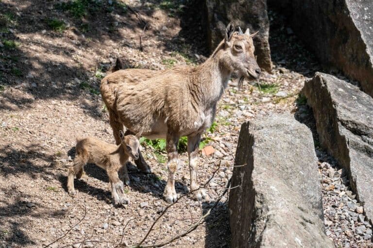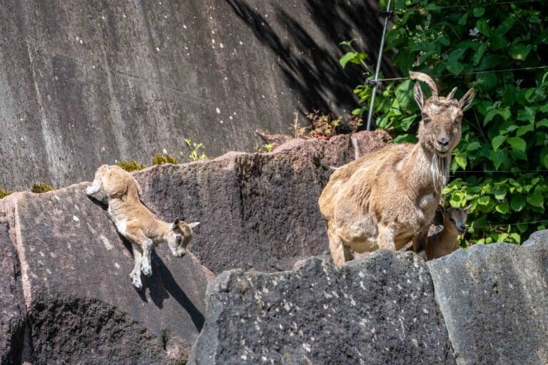 Das Gehege der Markhore ist steil und felsig – wie die Gebirgsregionen Zentralasiens, woher die auch Schraubenziegen genannten Paarhufer ursprünglich stammen. „Die Hufe der Tiere sind an den trockenen, steinigen Untergrund angepasst“, erläutert Kuratorin Ulrike Rademacher. „Wenn der Boden zu weich ist, bekommen sie Probleme mit den Klauen.“