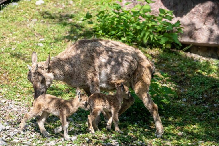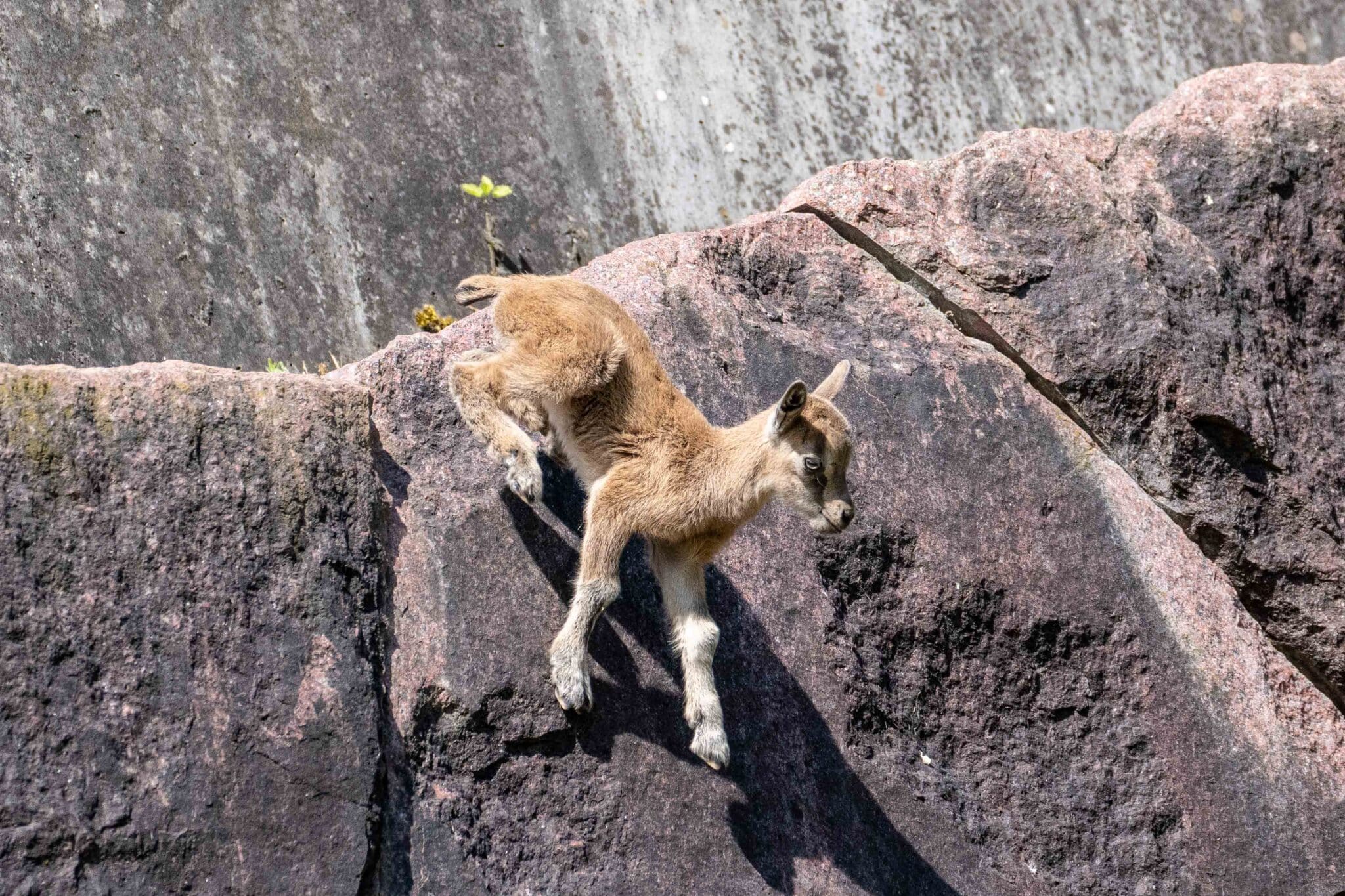 Bei den Kitzen ist von den imposanten Stirnwaffen – die bei den Weibchen übrigens deutlich kleiner ausfallen – noch nichts zu sehen. Die munteren Jungtiere bewegen sich aber auf ihrer Entdeckungsreise durch das felsige Gelände schon fast genauso geschickt wie ihre Eltern.