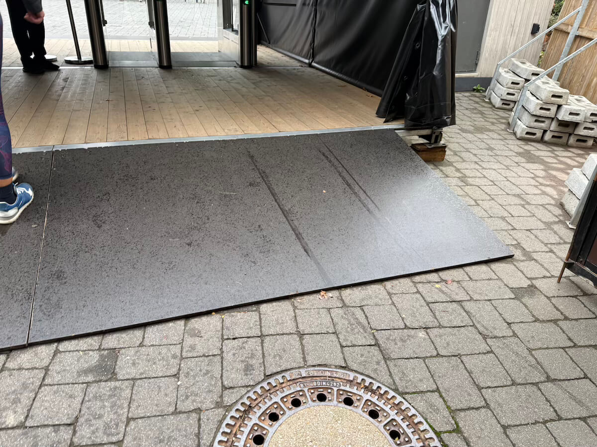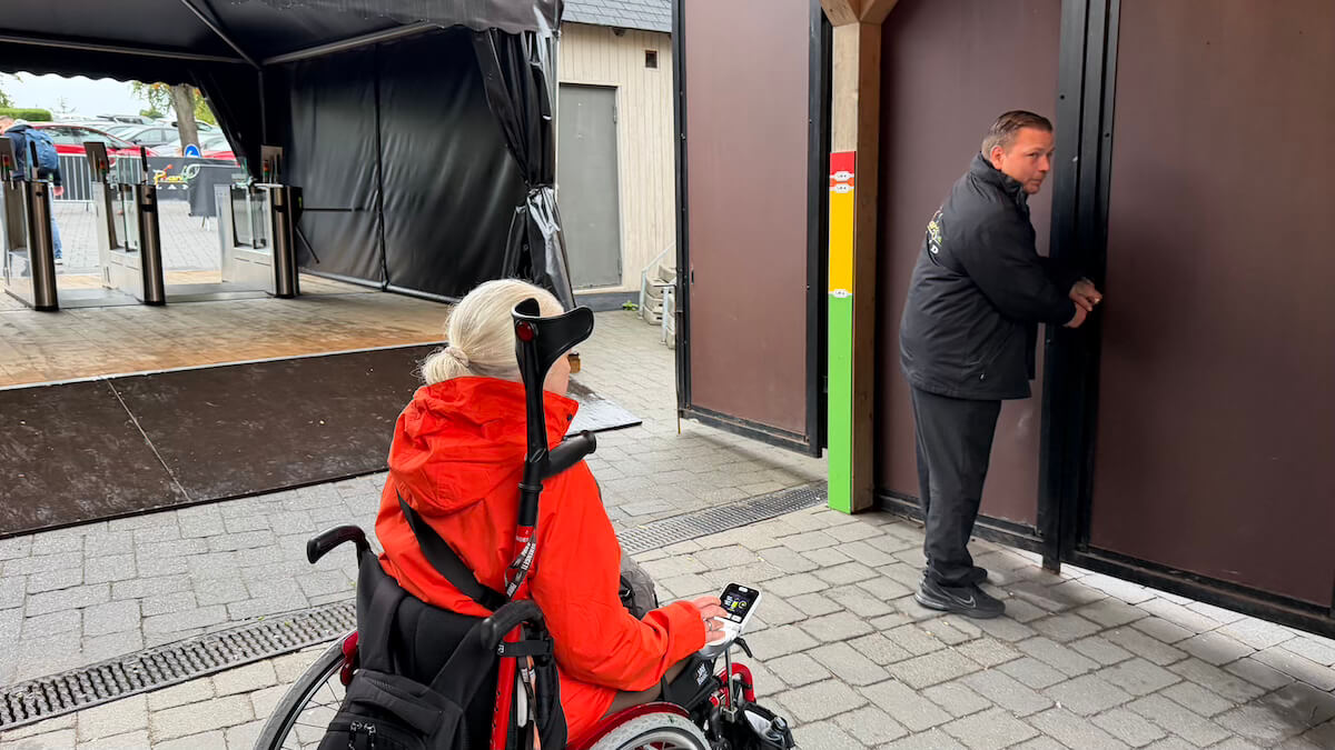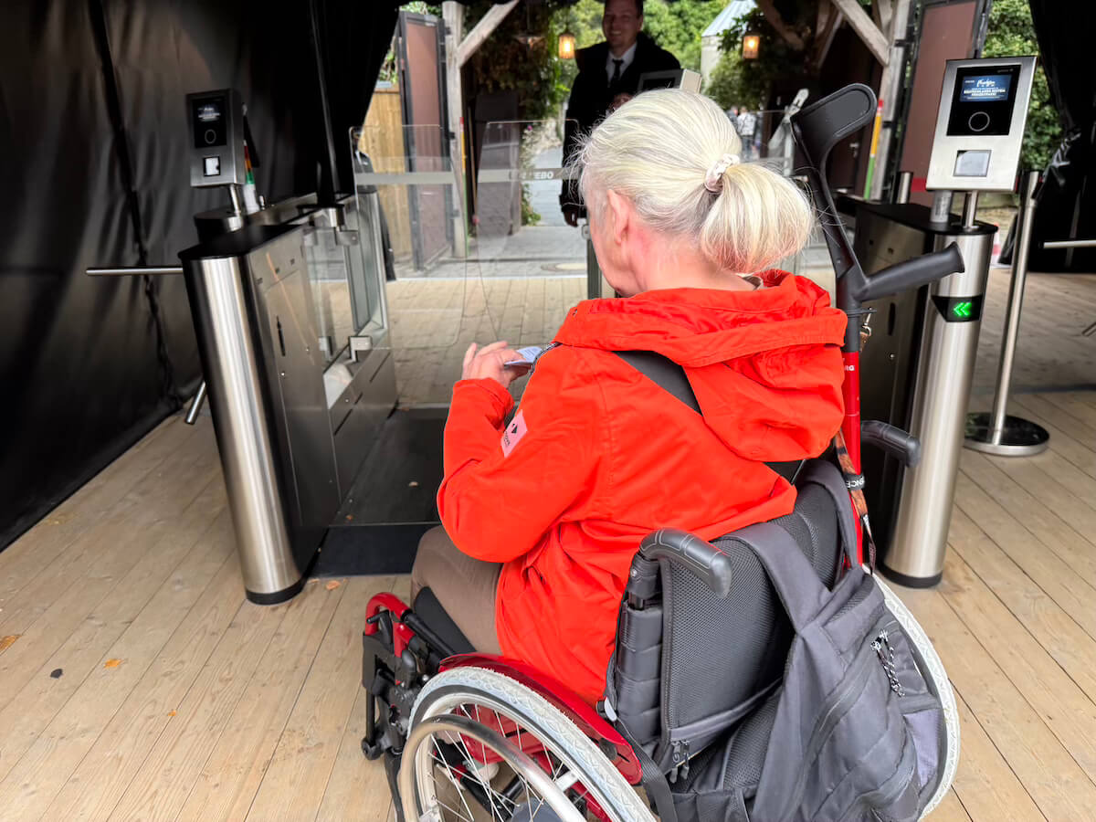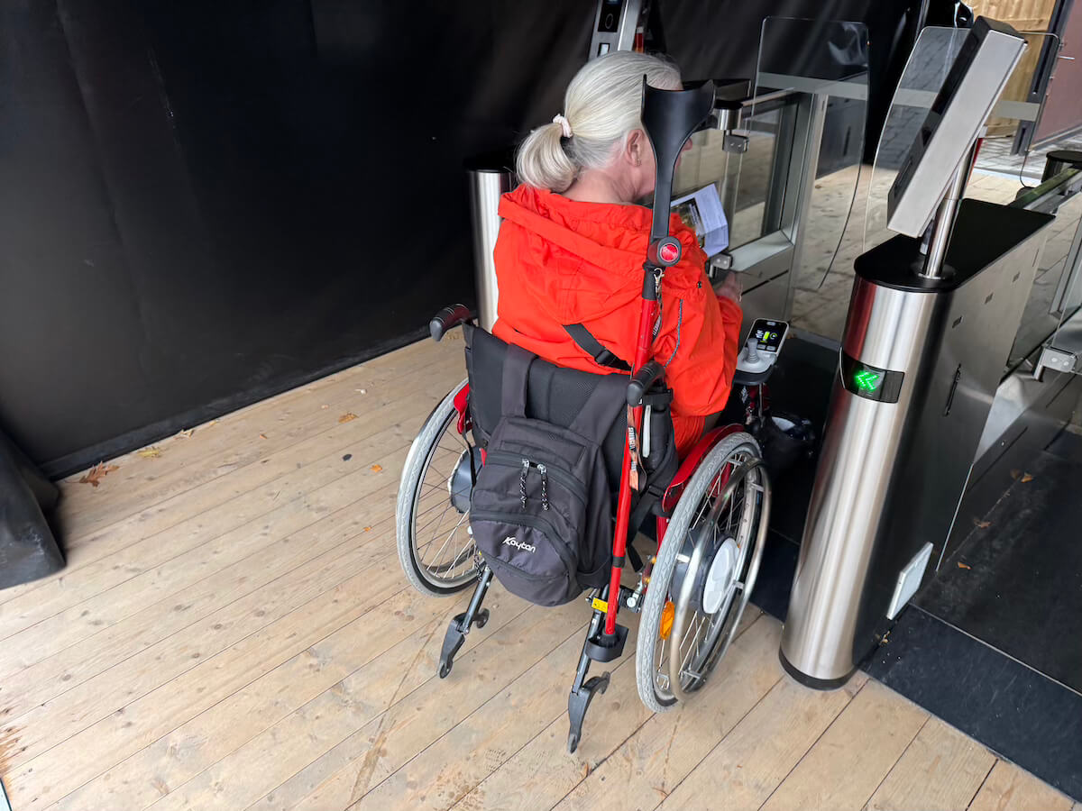 Am Eingang direkt das erste Problem. Die Schleusen am Eingang sind recht eng. Zum Glück passt der Rollstuhl von Ursula durch. Dahinter ist sie doch eine Rampe, die mit sicher knapp 25 % Neigung viel zu steil ist. Gerade wenn es nass ist, ist das lange Stück sehr rutschig. Wenn viele Menschen dort sind, auch eine Gefahrenquelle.