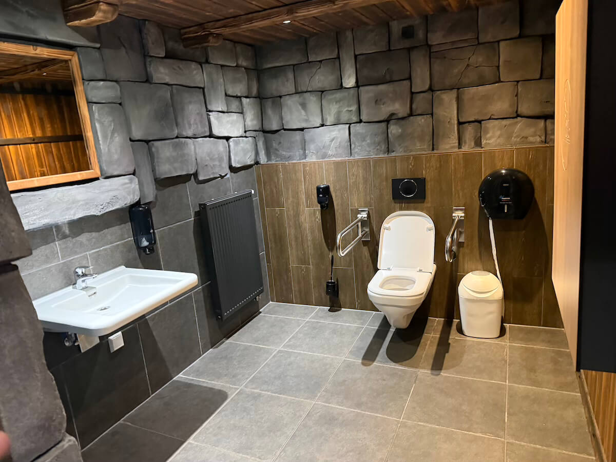 Hier stoßen wir allerdings auf das nächste Problem, denn leider ist es nicht möglich, das WC abzuschließen. Der Spiegel hängt ebenfalls zu hoch und ist für Rollstuhlfahrer nicht einsehbar. Eine Notrufleine gibt es auch nicht und so ist bei einem Sturz keine Hilfe erreichbar.