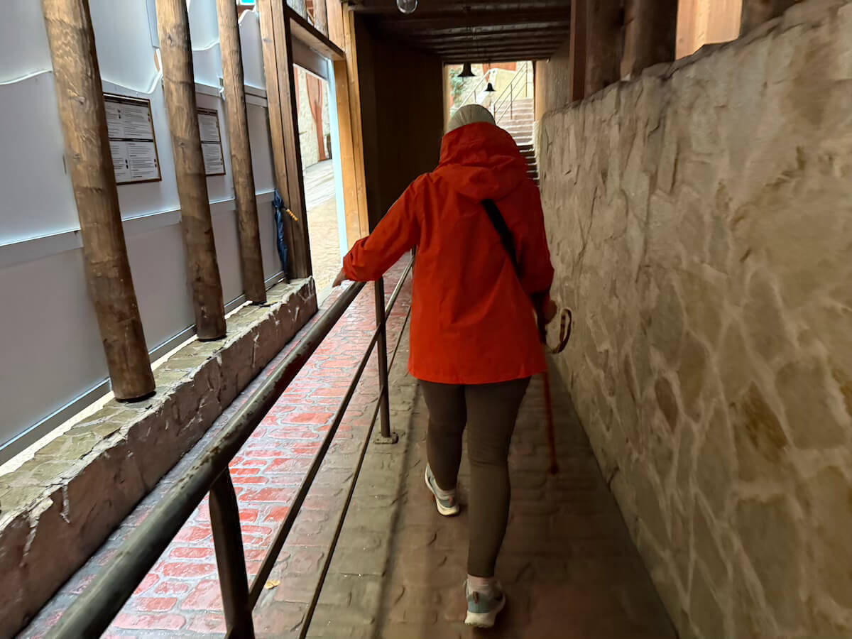 Ebenfalls fiel es mir im Themenbereich Klugheim sehr schwer, eine Treppe hinunterzugehen. Durch die fehlende Stufenmarkierung war kaum erkennbar, wo die Treppe eigentlich endet. Zudem war sie nass und die Lichtverhältnisse eher ungünstig, was den Abstieg zusätzlich erschwerte. Eine Stufenmarkierung würde hier sicher helfen.